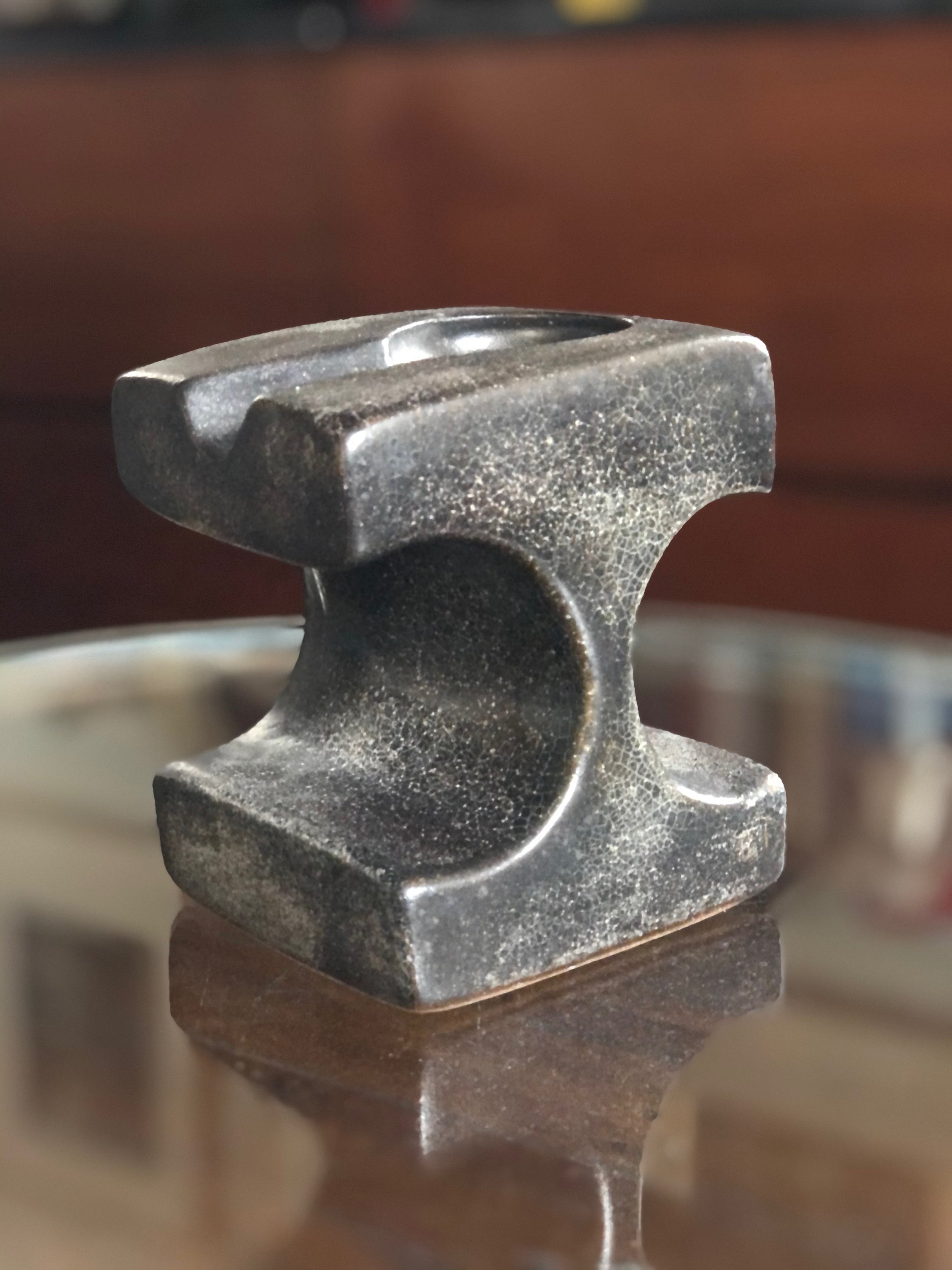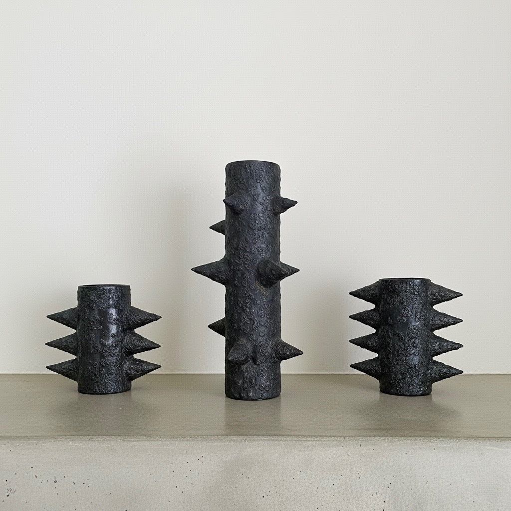 Cratered textures and metallic patinas — objects that feel ritualistic, more relic than vessel.