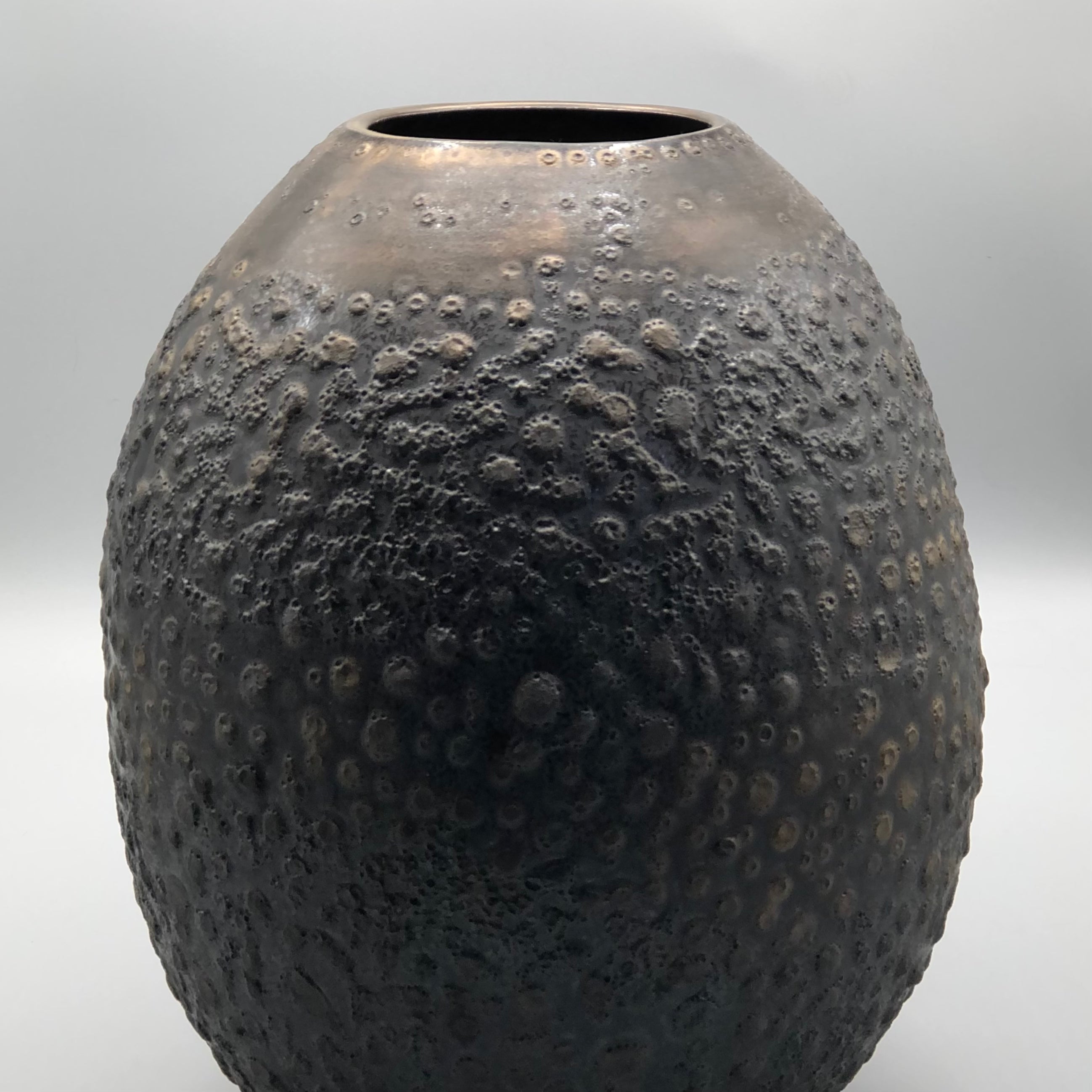 Her vessels feel unearthed rather than made — relics from a culture that never existed but somehow feels familiar. Surfaces aren’t applied; they’re coaxed from the clay, shaped by the volatile physics of the kiln. Cratered, burnished, or veined with improbable color, each piece resists passivity. It asks to be noticed, handled, and remembered.